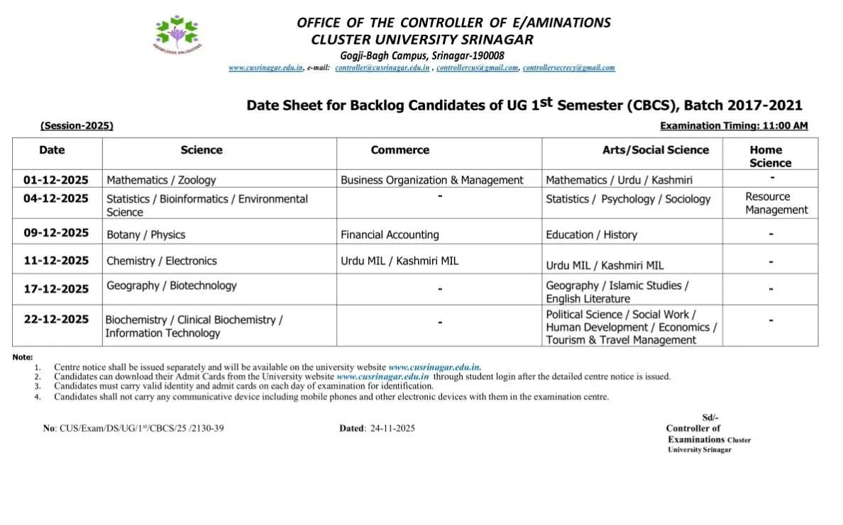The release of the UG 1st Semester Backlog Date Sheet 2025 by Cluster University Srinagar is an important update for thousands of students across the valley. Candidates are advised to carefully note their exam dates, download admit cards on time, and follow all university-issued guidelines. For further updates, visit the official website – www.cusrinagar.edu.in