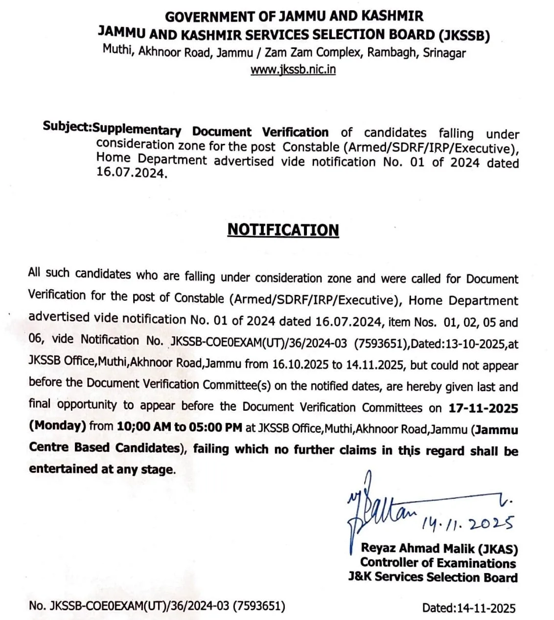 The Jammu and Kashmir Services Selection Board – JKSSB has published important notification PDF for JKSSB Constable Document Verification 2025 for those candidates falling under the consideration zone for the posts of Constable – Armed / SDRF / IRP / Executive in the Home Department. This supplementary notification provides a last and final opportunity for candidates who were previously called for Document Verification but did not appear on the scheduled dates. The notification has been published under No. JKSSB-COEOEXAM(UT)/36/2024-03 (7593651) on 14-11-2025 and is offering candidates final chance to complete the mandatory verification process. This is a critical step in the selection procedure, and missing this final window will result in automatic disqualification.