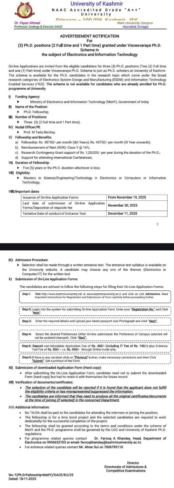 The University of Kashmir has announced the PhD Admission 2025 for multiple research program which including a prestigious fellowship-based intake under the Visvesvaraya Ph.D Scheme funded by the Ministry of Electronics and Information Technology – Government of India. This scheme provides excellent financial support to eligible research scholars and is available specifically for the discipline of Electronics & Information Technology. With the release of the latest admission notification, Kashmir University continues its commitment to developing cutting-edge research and offering opportunities that align with national academic standards. This article will provide information about a comprehensive and student-friendly explanation of the admission process, seats, eligibility, entrance schedule and steps for submitting the online form.